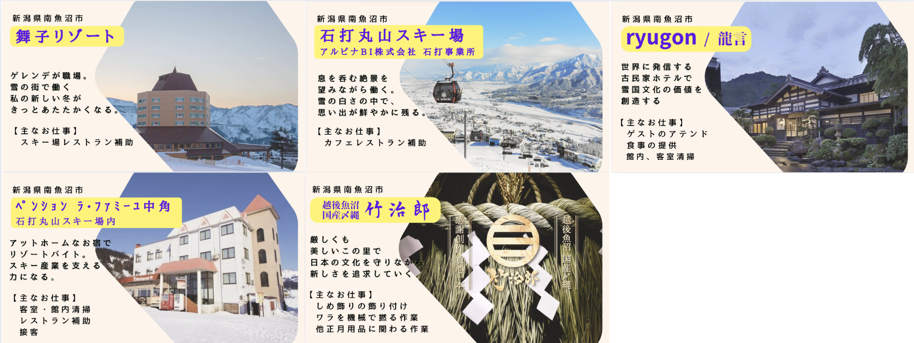 本プログラムの特徴は、企業さんへの就労・休日の観光をはじめ、同じ参加者や南魚沼で活躍する「ひと」と