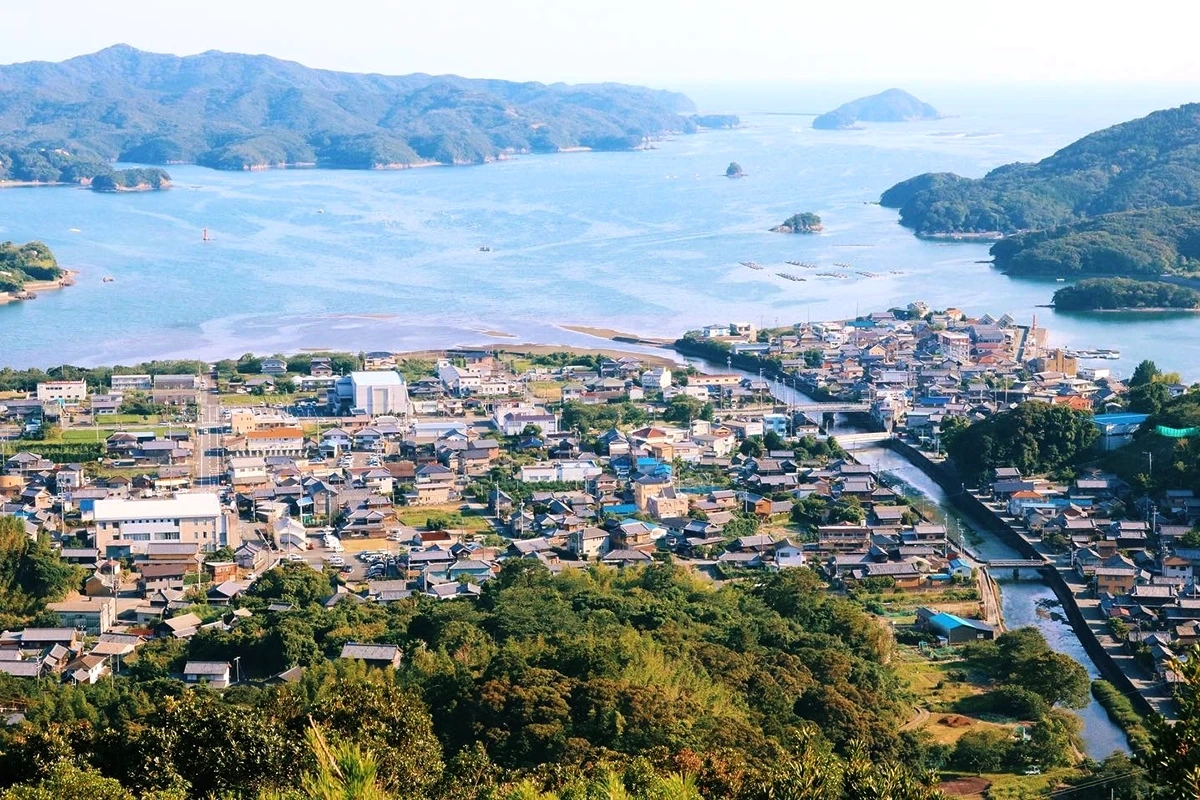 町内にあるいくつもの展望台からは、複雑に入り組んだ海岸線の美しい造形を眺めることができ、なかでも「恋人の聖地」に認定された見江島展望台では、ハート型の入り江と満天の星空が訪れる人々を魅了します。養殖やまき網漁業で船が行き交う漁港の風景や、みかん畑で働く人々、豊漁や無病息災を願う祭りに集う住民たちの姿など、日々の営みがこの町ならではの美しい景色を形づくっています。