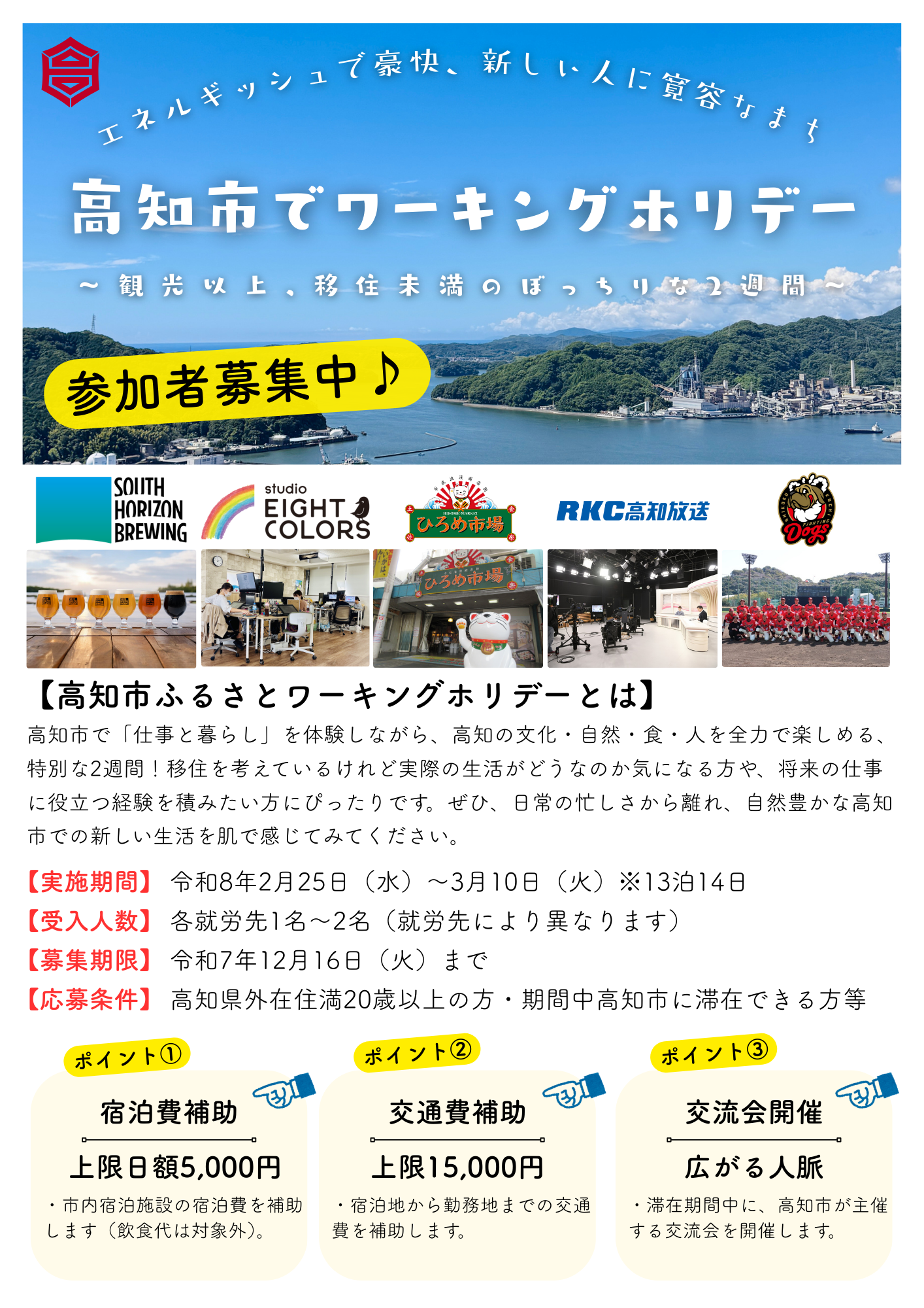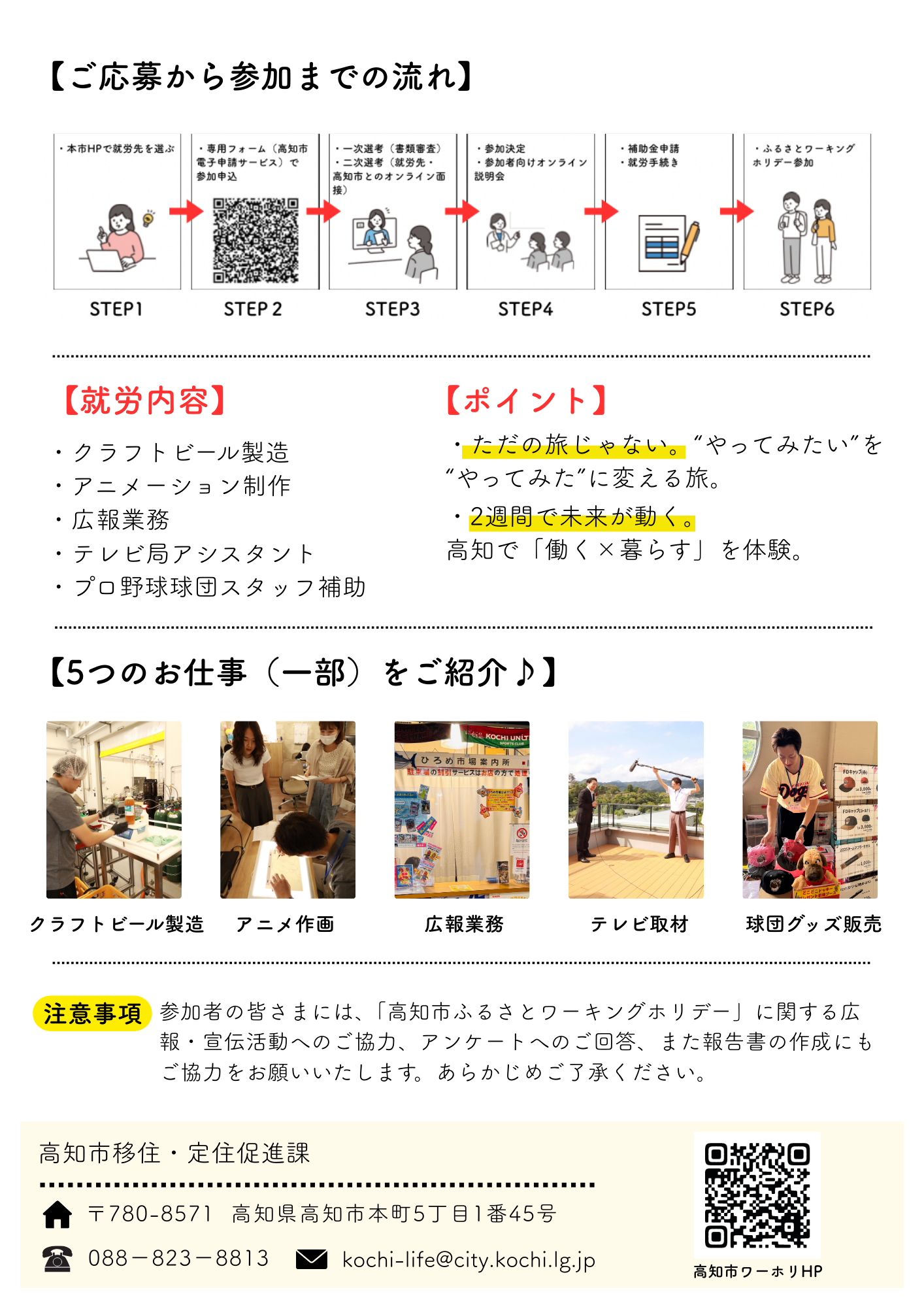 ◎高知市ふるさとワーキングホリデー特設サイト:https://www.city.kochi.kochi.jp/kochi-life/pages/kochifwh.html