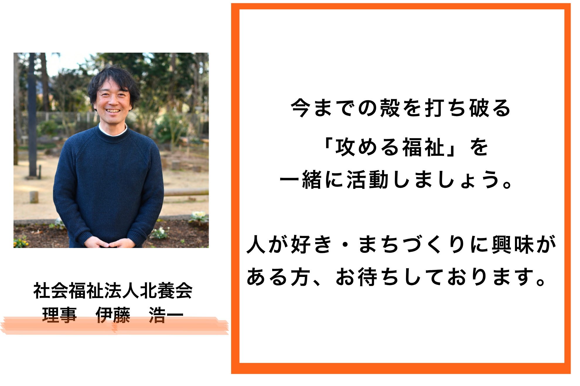 北養会は、地域で生きる誰もがいきいきと元気で暮らしていけるよう、高齢者介護や障がい者支援はもちろんのこと、地域づくり、まちづくりにも取り組む社会福祉法人です。