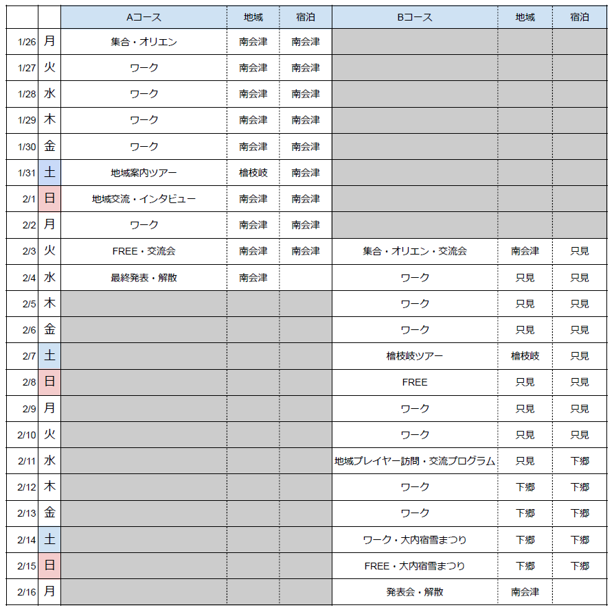 2週間の期間中、下郷町・檜枝岐村・只見町・南会津町を移動しながら交流や仕事を経験します。